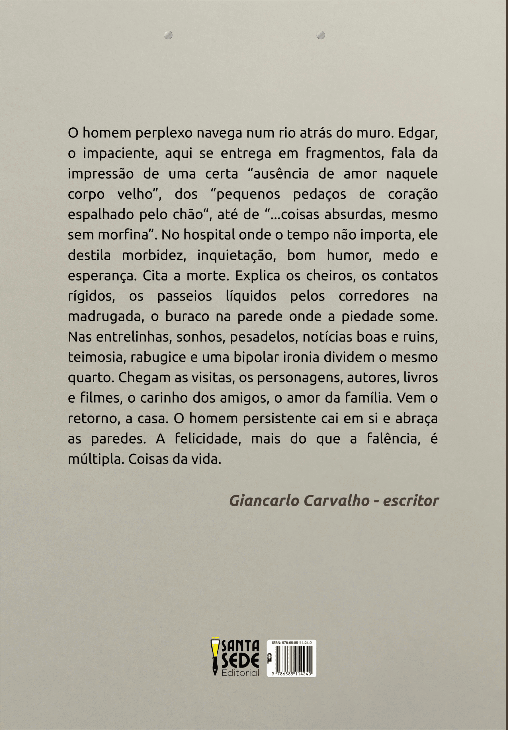 Edgar, no hospital onde o tempo não importa, destila morbidez, inquietação, bom humor, medo e esperança. Cita a morte. Explica os cheiros, os contatos rígidos, os passeios líquidos pelos corredores na madrugada, o buraco na parede onde a piedade some. Nas entrelinhas, sonhos, pesadelos, notícias boas e ruins, teimosia, rabugice e uma bipolar ironia dividem o mesmo quarto. Chegam as visitas, os personagens, autores, livros e filmes, o carinho dos amigos, o amor da família. Vem o retorno, a casa.